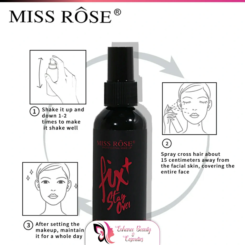 Description: Miss Rose Fix+ Stay Over Fixer is a makeup setting spray designed to enhance the longevity of your makeup while providing a fresh, natural finish. This lightweight formula helps to lock in your makeup, keeping it in place throughout the day.